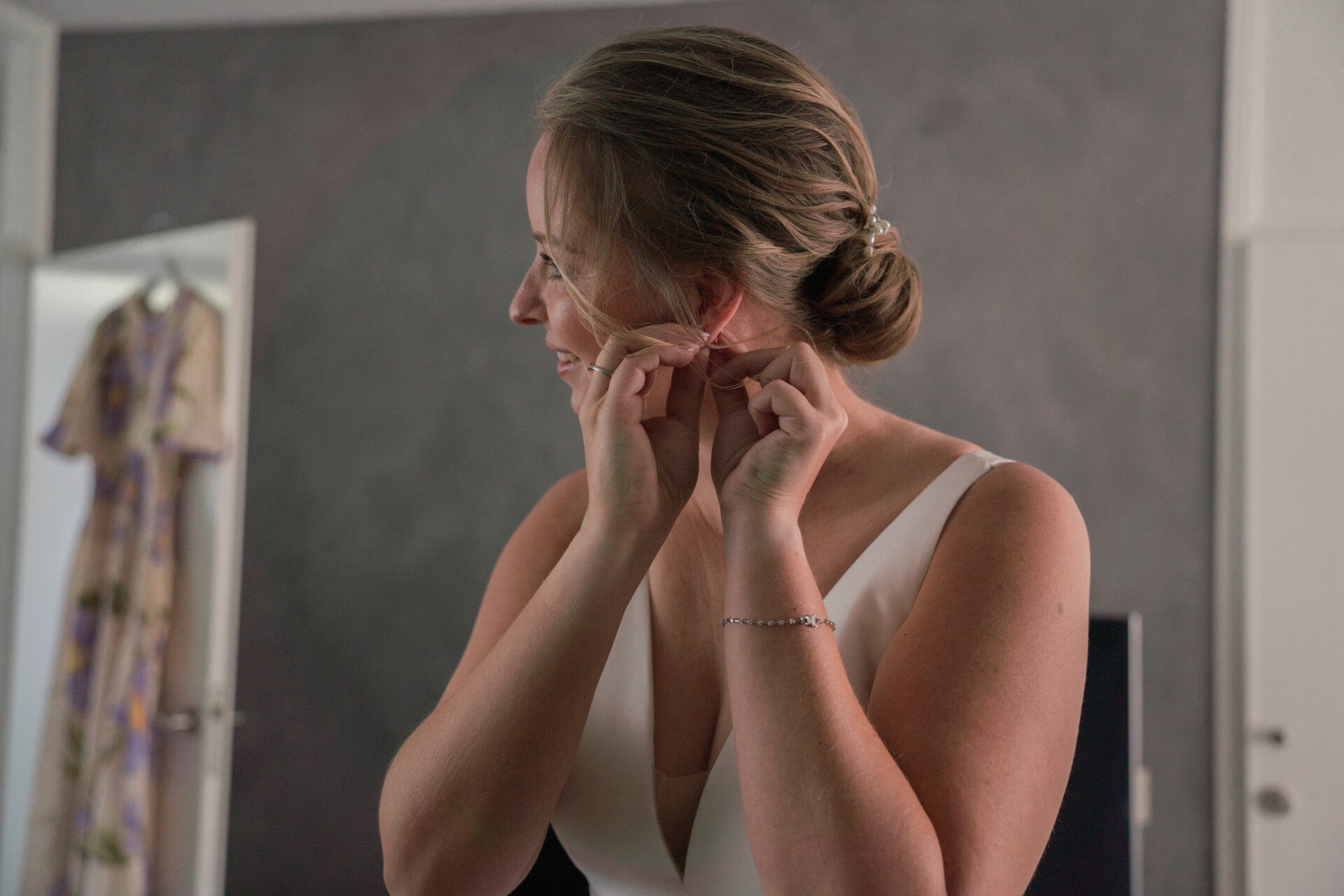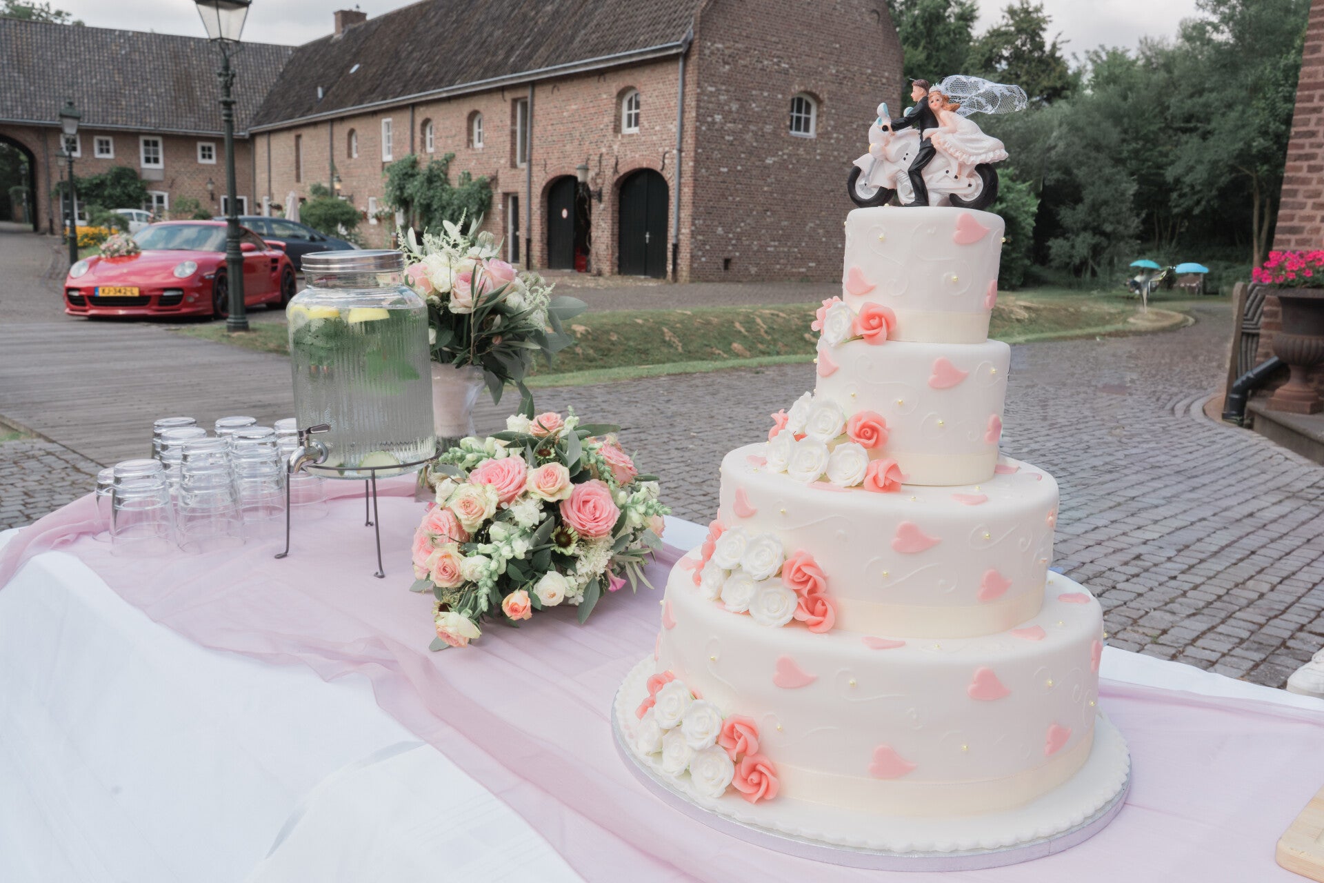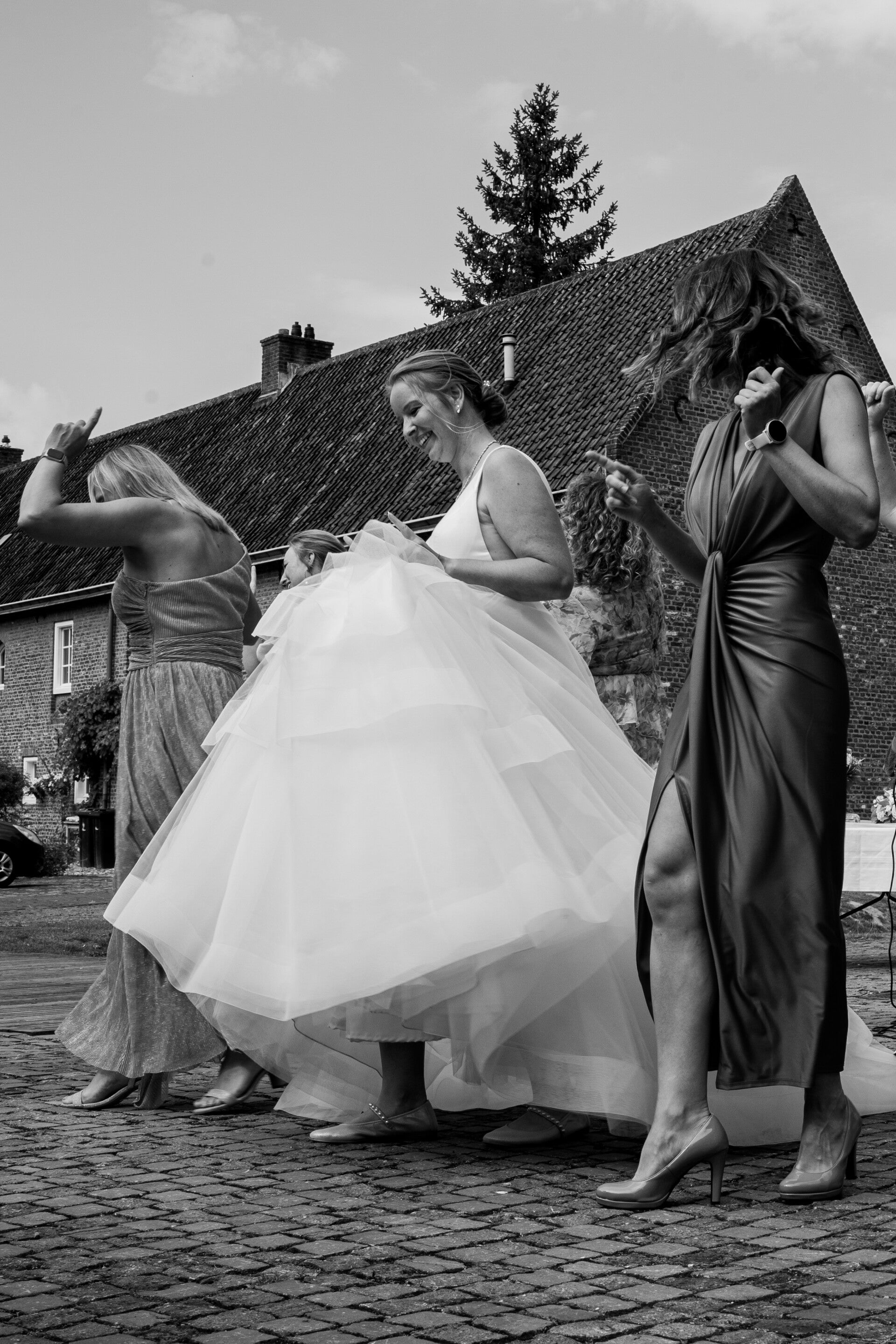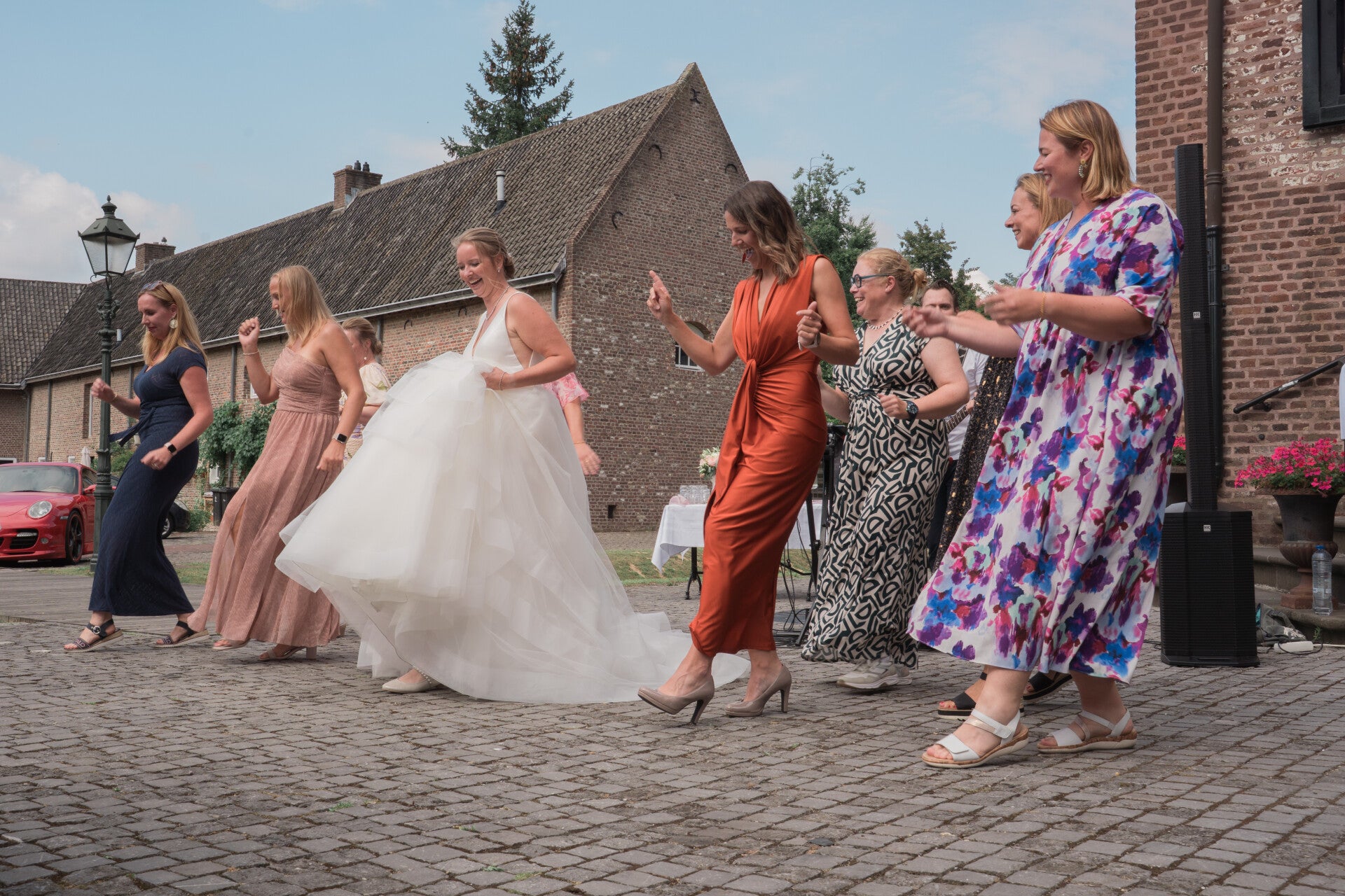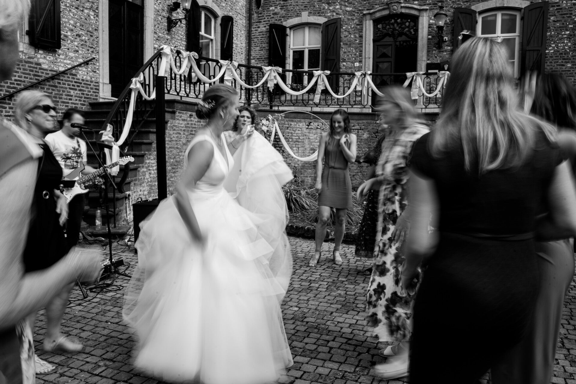 Het bruidspaar arriveerde in stijl, helemaal passend bij hun liefde voor sportieve auto’s. Een stoere entree die direct zorgde voor een persoonlijke en unieke touch. Daarna volgde een intieme ceremonie op de binnenplaats en in de romantische setting van het kasteel, omringd door familie en vrienden. Elk moment – van de eerste blik tot de emoties tijdens de geloften – was gevuld met pure liefde en spontaniteit.